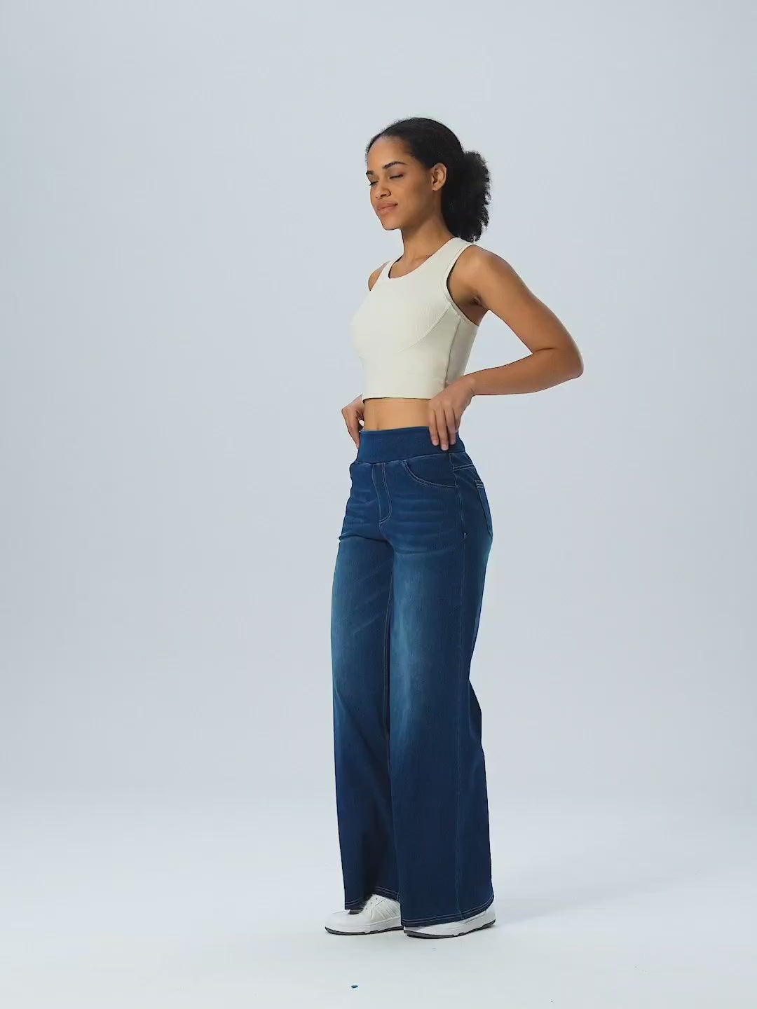 Onze high-waist comfort denim heeft een brede tailleband die buik en taille subtiel ondersteunt, zonder druk of knelling.